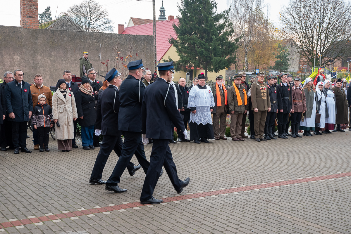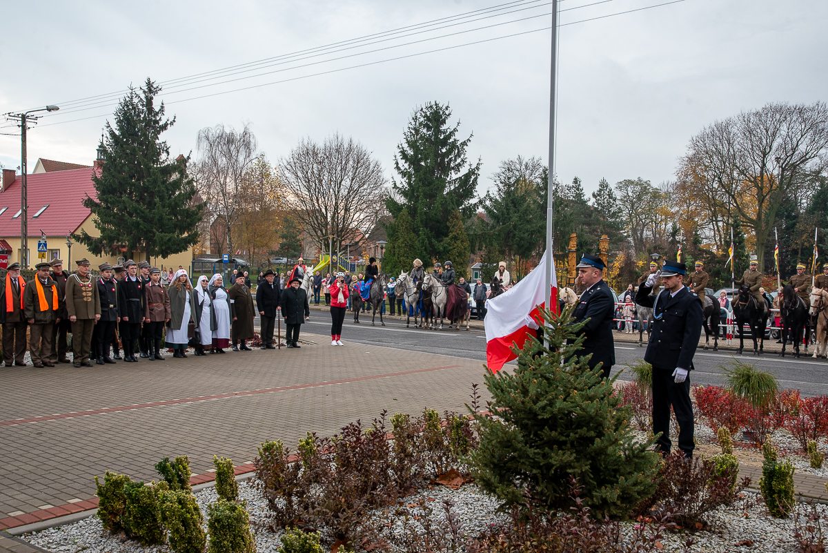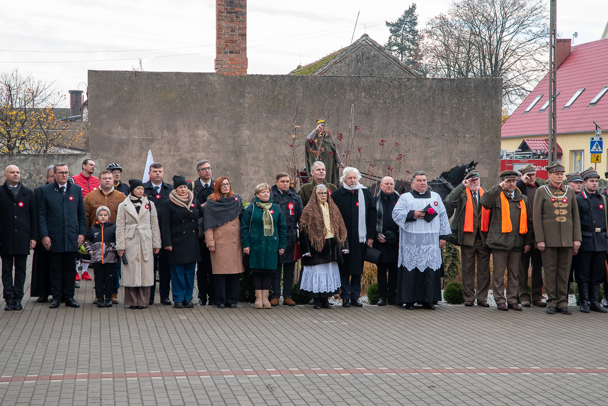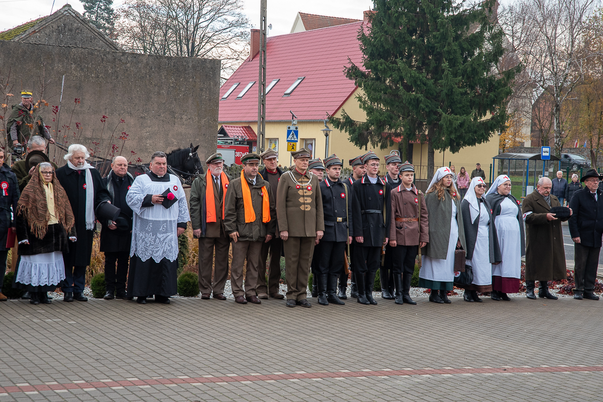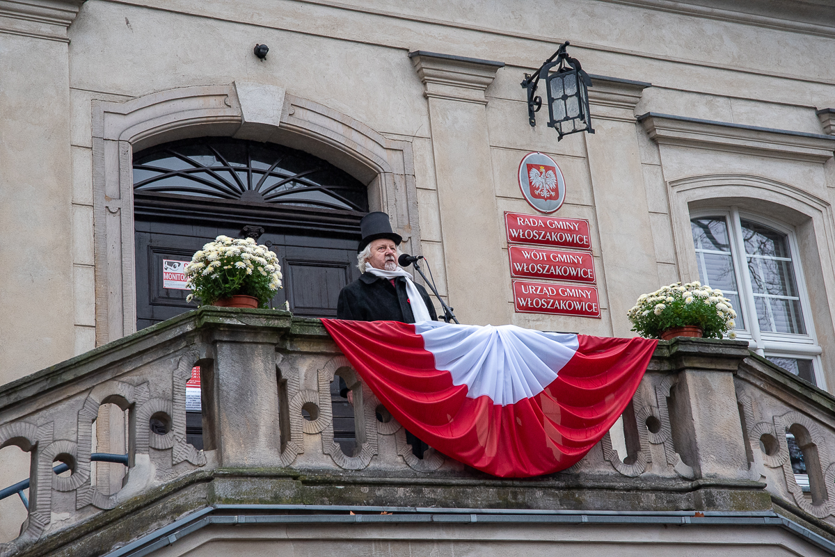 Na część główną uroczystości przed Pałacem Sułkowskich korowód został wprowadzony przez Mażoretki Twins oraz Młodzieżową Orkiestrę Dętą Blue Brass Band, która już pod budynkiem urzędu Gminy Włoszakowice odegrała hymn Polski oraz Warszawiankę – hymn gminy Włoszakowice. W tym miejscu wójt Marek Wąsowicz powitał wszystkich uczestników przejazdu oraz zgormadzonych i podziękował za udział w uroczystościach mimo niesprzyjającej aury. Do zebranych zwrócił się także Marszałek Józef Piłsudski oraz Premier Ignacy Jan Paderewski, którzy w swoich wystąpieniach odnieśli się do patriotycznych wartości oraz odradzającego się państwa polskiego.