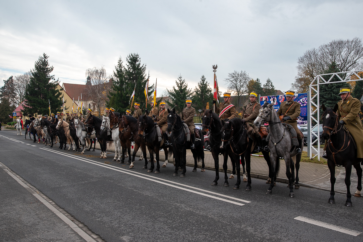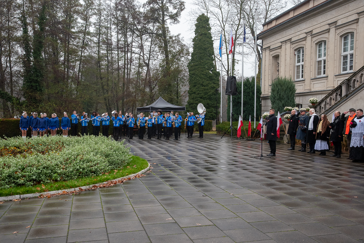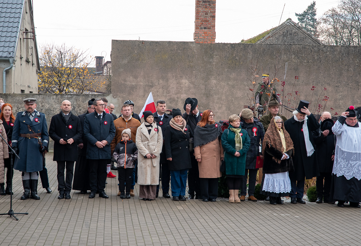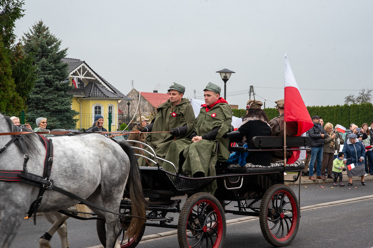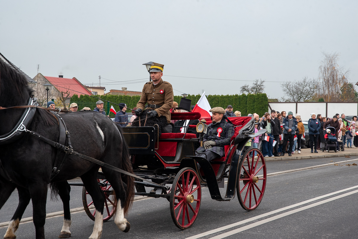 Na część główną uroczystości przed Pałacem Sułkowskich korowód został wprowadzony przez Mażoretki Twins oraz Młodzieżową Orkiestrę Dętą Blue Brass Band, która już pod budynkiem urzędu Gminy Włoszakowice odegrała hymn Polski oraz Warszawiankę – hymn gminy Włoszakowice. W tym miejscu wójt Marek Wąsowicz powitał wszystkich uczestników przejazdu oraz zgormadzonych i podziękował za udział w uroczystościach mimo niesprzyjającej aury. Do zebranych zwrócił się także Marszałek Józef Piłsudski oraz Premier Ignacy Jan Paderewski, którzy w swoich wystąpieniach odnieśli się do patriotycznych wartości oraz odradzającego się państwa polskiego.