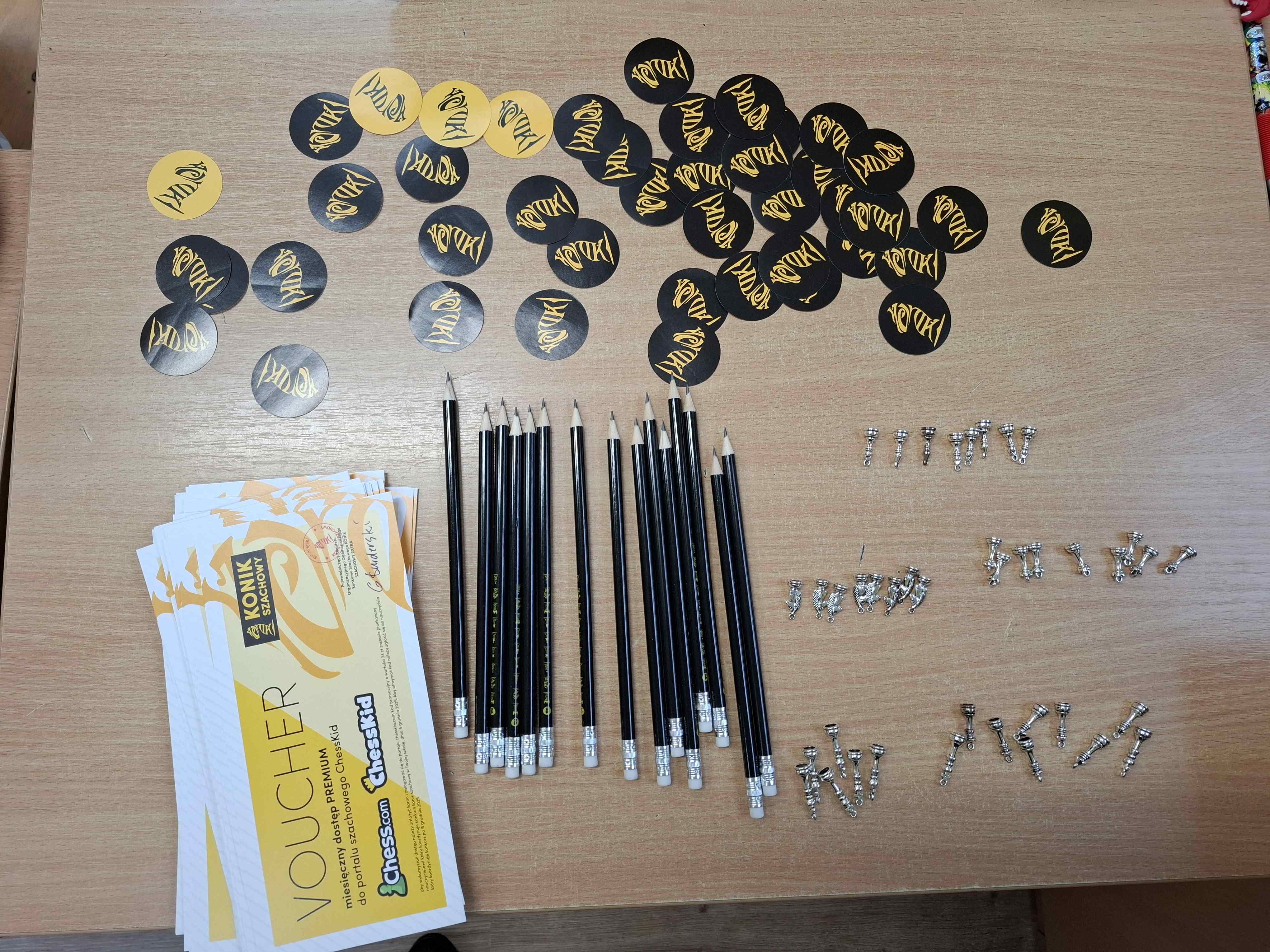 Wszyscy uczestnicy konkursu otrzymali upominki od organizatorów - zawieszki w kształcie figur szachowych, voucher na dostęp do szachowych platform edukacyjnych, naklejki.